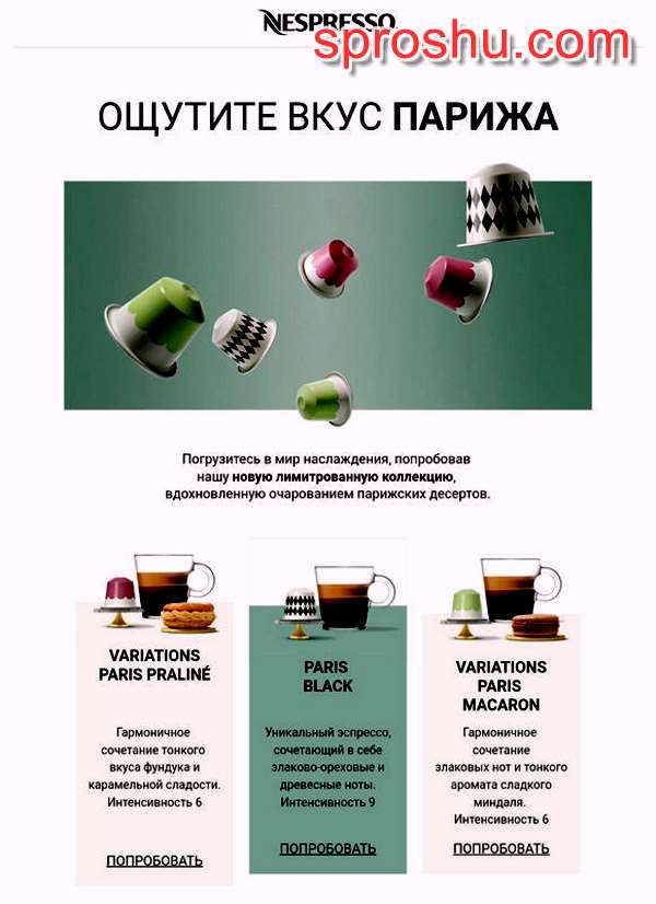Nespresso выпустил новую коллекцию Nespresso Variations. Это лимитированная коллекция различных вкусов и ароматов кофе. Помимо этого были разработан новый дизайн красивых упаковок. Данная продукция посвящена французской столице - Парижу.