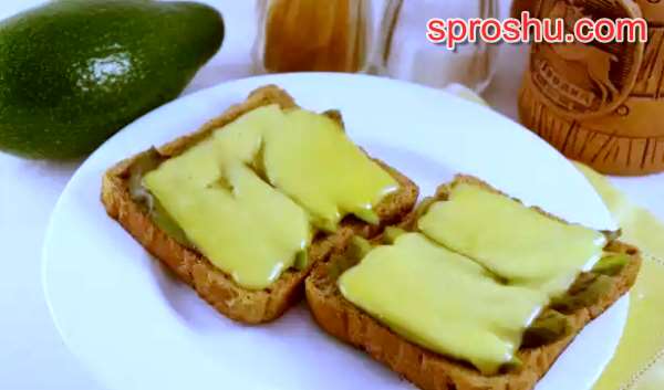 В первую очередь почистим авокадо от кожуры и удалим ядрышко. Затем нарежем авокадо на тоненькие кусочки. Твёрдый сыр также нарежем на тоненькие пластины. На сковородке без масла слегка прижарим четыре кусочка зернового хлебушка. Положим на прижаренный хлеб кусочки авокадо, на авокадо положим пластины сыра и готовим на небольшом огне примерно четыре минуты до того момента, когда сыр начнёт плавиться. Готовые бутерброды с авокадо и сыром переложим на тарелку и подадим на стол. Приятного аппетита!