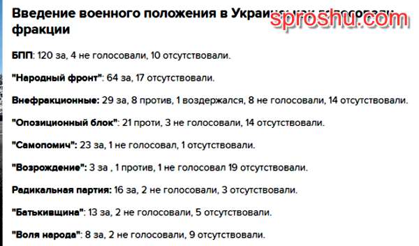 Большинством голосов Рада приняла закон о введении военного положения на 30 дней. Депутаты голосовали, как и ожидалось от партий. Возрождение удивили свои отсутствием на заседании. Президентские выборы в Украине пройдут в конце марта.