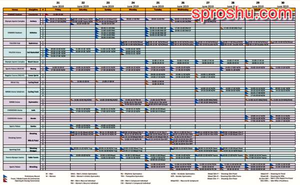 До начала вторых в истории Европейских игра еще более двухсот дней, а оргкомитет уже опубликовал программу и расписание соревнований. Также началась и продажа билетов. Как известно игры пройдут в течении десяти дней в столице Беларуси и за это время спортсмены (коих ждут боле 4000 человек) разыграю двести комплектов наград, первыми будут стрелки, а последний комплект уйдет трековикам (день открытия обойдется только предварительными стартами). Не стоит забывать, что в некоторых видах спорта эти старты являются отборочными на ОИ-2020. Посмотреть на полное расписание соревнований на Европиады можно в приложенном скрине, а для тех кто не имеет под рукой лупы, могу посоветовать скачать расписание на сайте мероприятия.