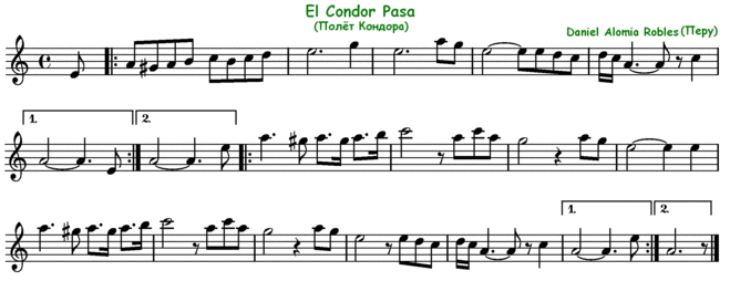 Когда знаменитый Пол Саймон услышал мелодию "Полёт Кондора" он считал, что это народная мелодия и песня. На самом деле её написал и сочинил перуанский композитор Даниэль Роблес в далёком 1913 году. Сочинил он свою композицию на мотив традиционных мелодий перуанских Индейцев. Основным инструментом в исполнении этой замечательной мелодии является панфлейта. А начинающие музыканты могут для начала освоить "Полёт Кондора" на блокфлейте- она более простая для исполнителей. А ноты? Вот они: