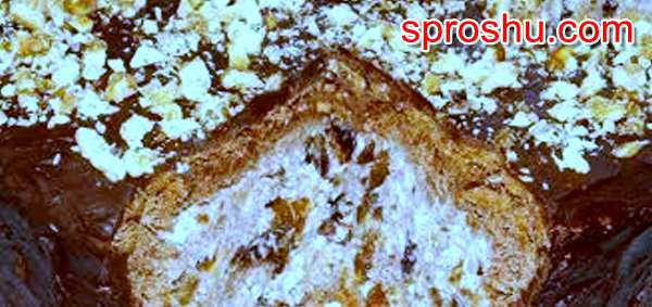 Возвращаемся к остывшему бисквиту. Срезаем ножом верхушку бисквита и откладываем её в сторону. Из бисквита нам надо вынуть весь мякиш, оставив только стенки и дно (как у Птичьего молока). Мякиш бисквита смешиваем с заливкой, выкладываем в «бисквитную чашу» и закрываем срезанной верхушкой. Осталось только залить торт глазурью. Для этого растапливаем 50 г сливочного масла, добавляем 2 ст.л. сахарной пудры, 2 ст.л. какао и 100 г. горького шоколада. Не переставая нагревать, размешиваем до полного растворения шоколада.