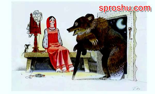 Мачеха, прознав про это очень сильно рассердилась и почернела от зависти. Решила она и свою дочь отправить в лес. Дочь оказалась жадной и грубой и не угостила мышку, мышка не стала девушке помогать и задрал её медведь.