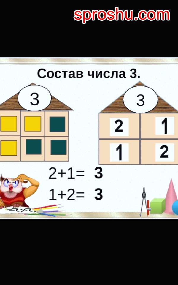 Пример лучше всего привести, используя счетные палочки или другие подручные предметы (ручки, карандаши и т.д.). Берем 3 счетные палочки и просим ребенка разделить их на две "кучки" и положить в разные стороны. Получится, что в одной стороне лежит 1 сч.палочка, а в другой - 2 сч. палочки. Так наглядно можно продемонстрировать состав числа 3 (состоит из 1 и 2).