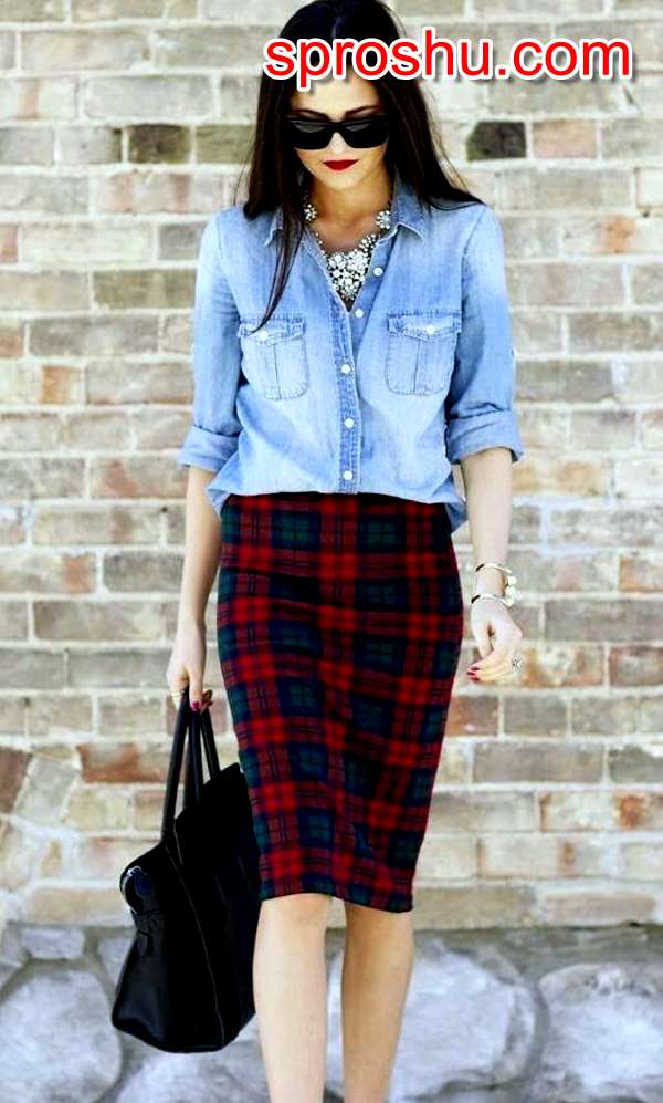 В зависимости от цветовой гаммы самой клетки можно подобрать однотонный верх. Если же не привязываться к цвету, будет неплохо смотреться с джинсовой рубашкой/черным свитером, белой T-shirt-кой.