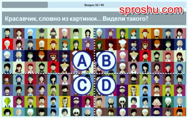 На 10 уровне Даню легко найти благодаря яркой полосатой маечке и задорному выражению лица. Остальные лица на картинке вообще без выражения и даже без глаз, не считая очков. Правильный ответ на этот уровень - "D"