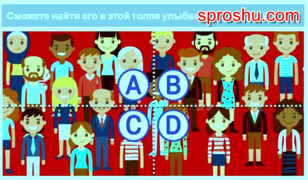 На 6 уровне викторины "Где же наш малыш Даня" людей немного, но у некоторых из них полосатые футболки, точно как у нашего малыша. Но это не помешает нам найти потеряшку. Он находится в секторе А. Правильный ответ на этот уровень - "А".