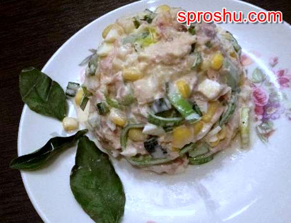 Для приготовления потребуется четыреста грамм законсервированного тунца, двести грамм законсервированной сладкой кукурузы, один огурец, пятьдесят грамм лука-порея, одно спелое яблоко, два яйца, повареная соль, молотый перец, пятьдесят грамм сметаны, пятьдесят грамм майонеза.