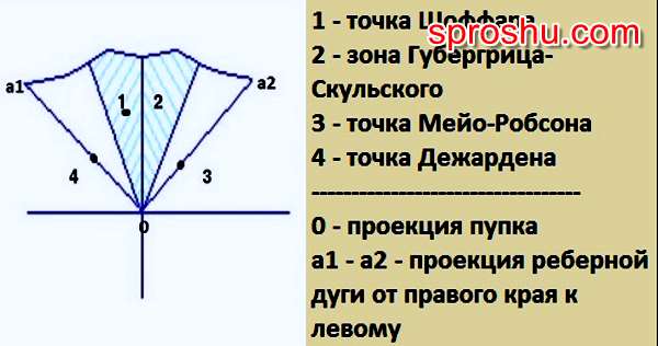 В диагностике хронического панкреатита есть такой диагноз как синдром Дежардена. Для его безошибочного диагностирования врачу необходимо методом пальпации найти точку Дежардена. Она находится примерно в такой области: на 4-6 см от пупка, ориентируясь по линии, которая соединяет правую подмышечную впадину с пупком.
