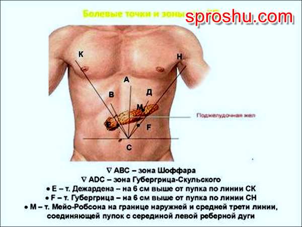 Эта зона (как и другие зоны и точки, упомянутые в ваших вопросах) используются в диагностике панкреатита. При пальпации живота в них есть болезненность, в зависимости от воспаления в головке, теле и/или хвосте поджелудочной железы. Лучше один раз увидеть: