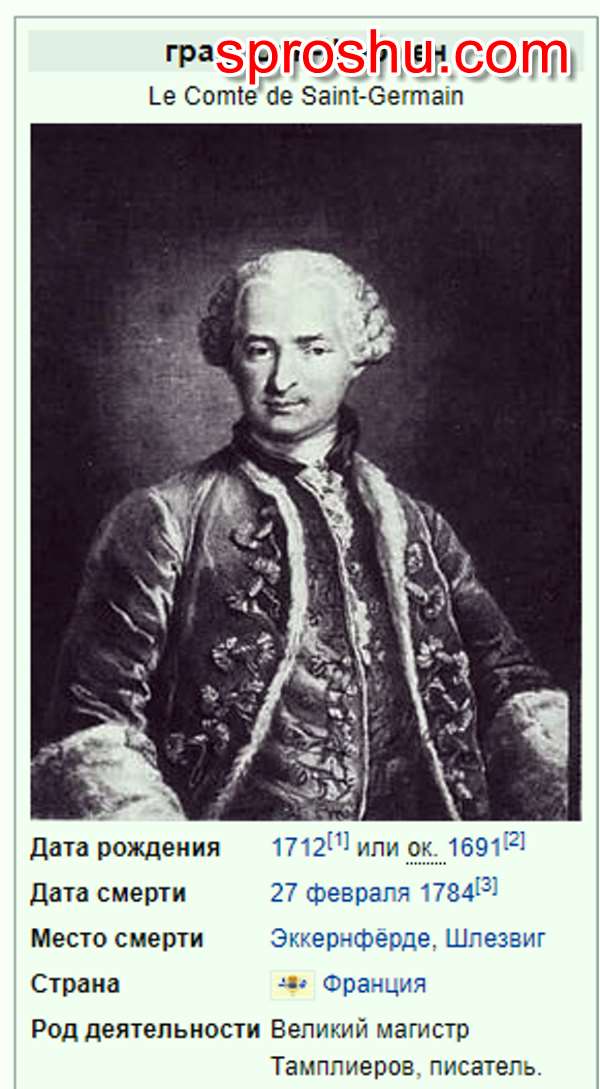 Небольшая историческая справка. Граф Сен-Жермен жил в эпоху Просвещения в правление французского короля Людовика 15 и был весьма грамотным человеком. Он знал почти все европейские языки, был путешественником и отлично разбирался в истории и химии. Выполнял некоторые дипломатические поручения.
