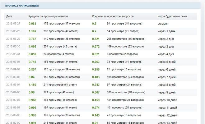 У меня 9 сентября просто катастрофический провал. В буквальных цифрах на фоне регулярного получения кредита, равного плюс 1 с копейками, фактические начисления 9 сентября составили 0,23. А в прогнозе 1,091 - все как обычно. Конечно, 0,23 как-то не очень обрадовало. Бесспорно надо работать, задавать вопросы, давать ответы, тогда и начисления будут радовать, только вот в прогнозах я так и не разобралась. Давно заметила, что иногда начисления и фактическое поступление кредитов отличается, даже создавала вопрос, вот здесь по ссылке http://www.bolshoyvo
