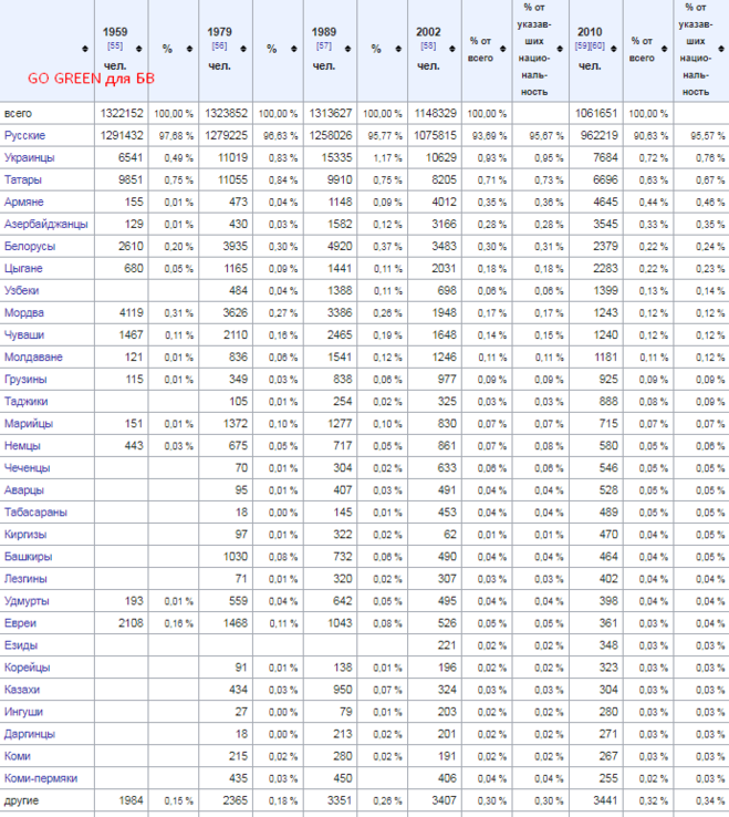 А также здесь есть представители таких народов: евреи и азербайджанцы, удмурты и мордва, эрзянцы и чеченцы, чуваши и марийцы и другие, в таблице ниже можно уточнить: