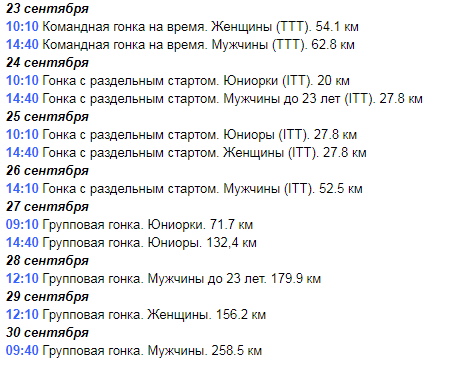 Гонки пройдут среди юниоров, мужчин до 23 лет и среди элиты у мужчин; а также среди юниорок и женской элиты.