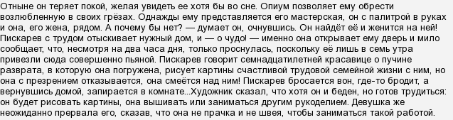 - Основная часть. Тут пишем о том, что мечты и реальность Пискарёва не совпали, и что как человек очень ранимый он отказался принять жестокую действительность и убивает себя, перерезав горло. Всё дело в том, что девушка, которой увлёкся Пискарёв оказалась проституткой и на его предложение покончить с этим ответила жестоким и циничным отказом.