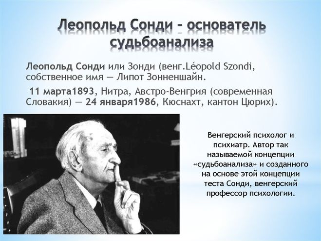 Леопольд Сонди (Leopold Szondi) известен тем, что являлся венгерским и швейцарским психологом, психиатром и психоаналитиком. Леопольд был рождён 11 марта 1893 года в австро-венгерском городе Нитра в семье евреев. В настоящее время этот город принадлежит Словакии. Леопольд Сонди прожил довольно долгую жизнь и умер 24 января 1986 года в доме престарелых в швейцарском городе Кюснахт в возрасте 92 лет.
