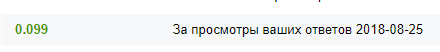 За сутки может быть один просмотр. Это может быть вызвано техническими работами на сайте. В летнее время, когда многие пользователи находятся в отпусках, заняты на приусадебных участках, на дачах, тогда посещаемость сайта БВ резко падает. Тем более, что учащиеся и студенты все отдыхают и у них нет академических вопросов. В это самое время наиболее удобно проводить разного рода технические преобразования. У меня создалось такое мнение, возможно есть более веские причины. За просмотры на дату 25 августа 2018 года начислено всего 0.099 кредитов, а в истории операций отсутствует дата 26 августа, когда должны поступить начисления за 25 число. Возможно сайт работал всего несколько часов в сутки и просмотров нет.