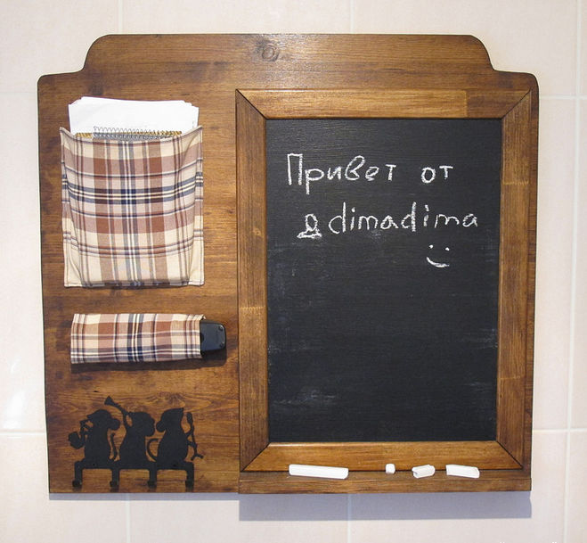 Доска и мел. Сейчас в большом ассортименте представлены доски, любого размера и ценника. Избавит от захламления магнитами холодильник и обезопасит детей от случайного поедания магнита( всяко бывает-знаю случаи когда и в нос умудрялись впихнуть)