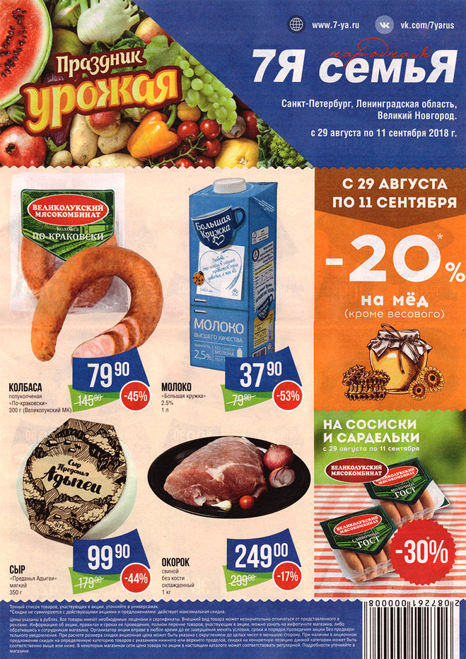 Под девизом "Праздник урожая" с 29 августа и до 11 сентября 2018 года в народных супермаркетах "7Я Семья" проходит очередная регулярная акция со специальными предложениями. Проще говоря, с хорошими скидочками на продовольственные товары.