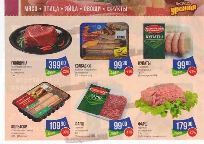 Говядина тазобедренная часть без кости - 20 % скидка. Колбаски куриные "Чевапчичи" - 31 % скидка.