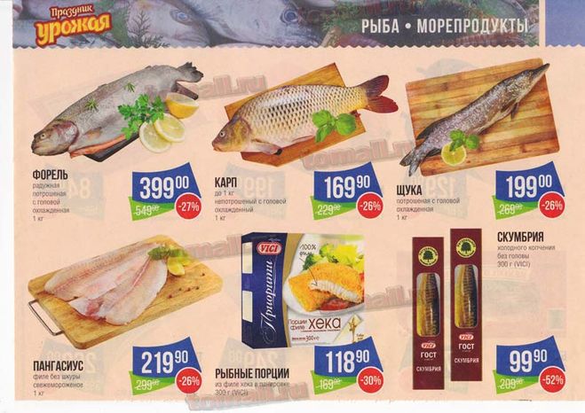 Форель радужная потрошёная с головой - 27 % скидка. Карп непотрошёный с головой - 26 % скидка.