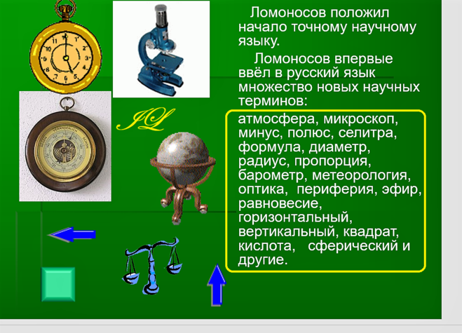 При такой обширной деятельности стоит ли удивляться обилию терминов, которые М. Ломоносов впервые стал использовать. Привожу один из рабочих слайдов презентации о Ломоносове для моих немецких школьников. Здесь можно увидеть слова, прекрасно освоившиеся в русском языке.