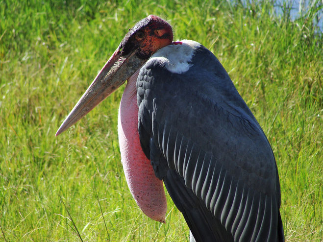 Мы уже привыкли, что аист, это добрая семейная птица, поставляющая людям детей. Но только не африканский аист марабу, а именно он и является тем самым зобатым аистом, ещё его называют адъютант. Наличие у него горлового мешка и послужило его названию, зобатый.