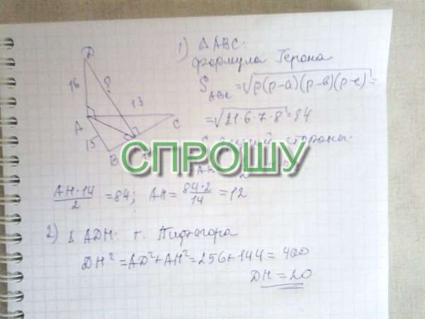 В треугольнике abc ab = 15,bc = 14, ac = 13. из вершины a к плоскости треугольника проведен перпендикуляр ad длиной 16. найти расстояние от точки d до стороны bc
