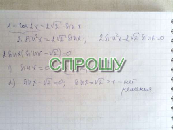 Решите уравнение 1-cos 2x = 2корень2 sinx