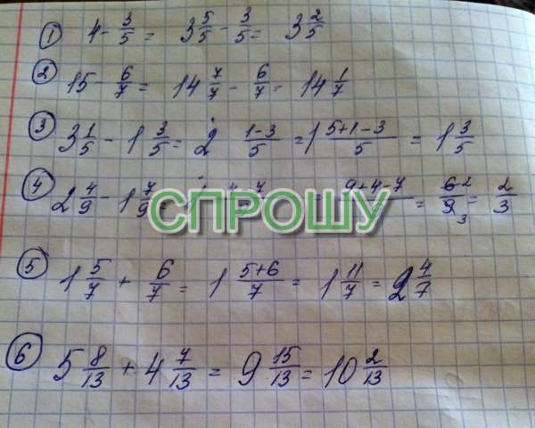 Выполните действия:4-3\5 ; 15-6\7 ; 3 1\5-1 3\5 ; 2 4\9-1 7\9 ; 1 5\7+6\7 ; 5 8\13 = 4 7\13.