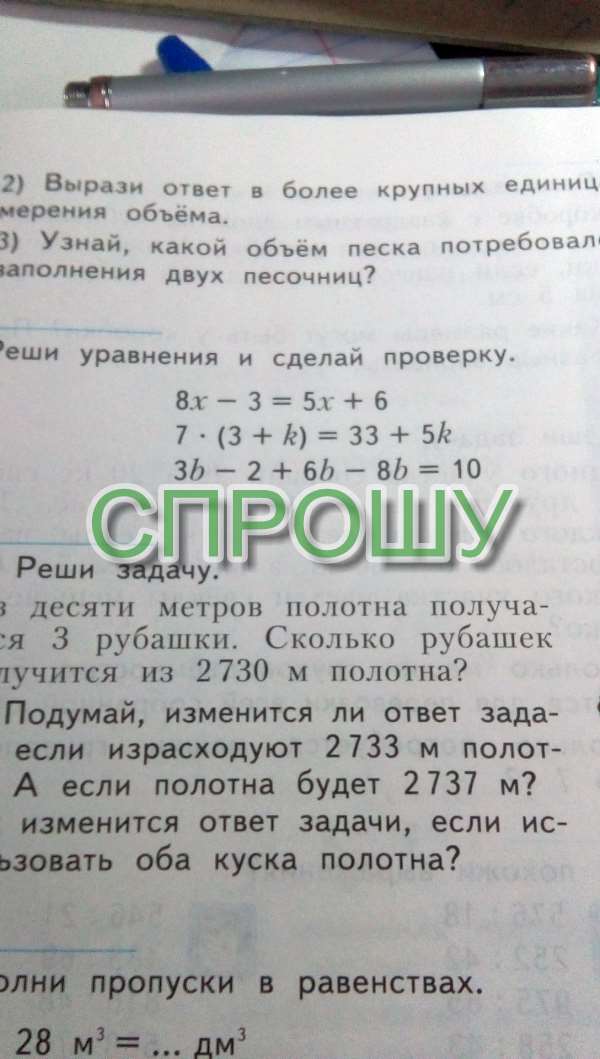 1)2730:10=273 2)273×3=819 рубашек выйдет В первом случае и во втором ответ не изменится,а если соеденить куски 3+7=10 получится еще 3 рубашки 8х--5х=6+3 3х=9 х=3 7к-5к=33--21 2к=12 к=6