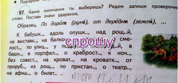 К бабушке (к земле), вдоль опушки (вдоль земли), над рощей (над землей), на выставке (на воде),на балконе (на коне), с площади (с печи), о смелости (о степи), по улице (по луне), у подруги (у земли),с дядей (с землей), в башне (в луне), в портфеле (в котле),о храбрости (о степи), к ночи (к печи), без совести (без степи), на кровати (на печи), на кроватке (на косе), от проруби (от степи), из рощи (из земли), по пристани (по печи), о театре (о моряке), на афише (на спине), о билете (о коне).