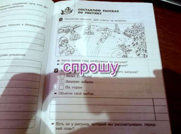 1)Мой выбор пал на вариант «Зимние забавы» из-за разных занятий людей на этой картинке и из-за лыжников понятно,что это зима.