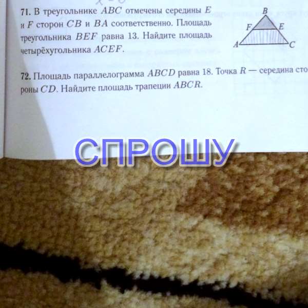 В треугольнике abc отмечены середины e f сторон cb ba Соответственно площадь треугольника bef равна 13 найдите площадь четырехугольника acef