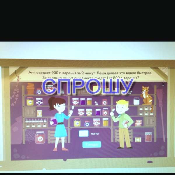 Аня за 1 м съедает 100гр(900/9) а леша 200 (100*2) значит за 1м они съедят 300 гр(100+200) 1кг 800 гр / 300гр =6 минут