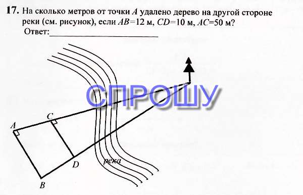 Пусть дерево есть точка О, тогда по подобию прямоугольных треугольников ΔOAB и ΔOCD - подобны как СД:АВ=10:12=5:6 и ОС:ОА=5:6, т.е. АС=1/6 ⇒ 1/6=50м ⇒ ОА=50*6=300м