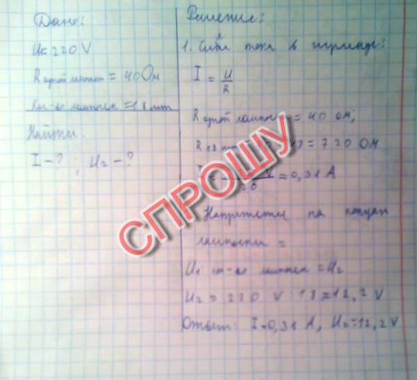 Елочная гирлянда, рассчитанная на 220 В, состоит из 18 лампочек сопротивлением 40 Ом каждая. Определите силу тока в гирлянде и напряжение на зажимах каждой лампочки. ДАНО НАЙТИ РЕШЕНИЕ