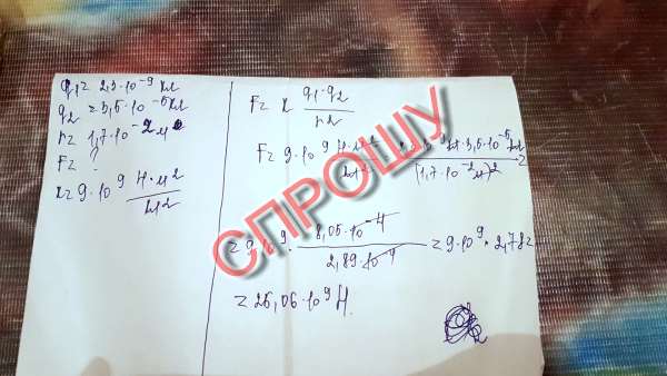 два заряди 2,3*10-9степені Кл і 3,5*10-5степені Кл розміщені в вакуумі на відстані 1,7 см .Визначити силу взаємодії між ними