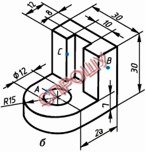 Чертёж детали на главном виде, вид сверху и вид слева(проекции точек расставлены).