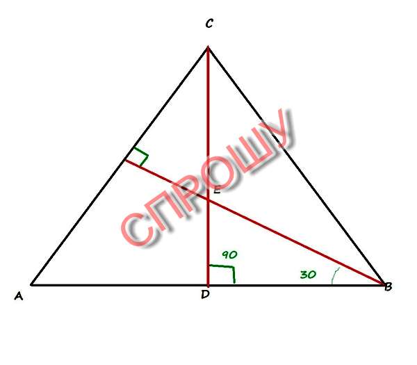 Угол в равностороннем треугольнике равен 60 градусов(180 / 3) значит данный угол разделенной биссектрисой - DBE равен 30 градусов.