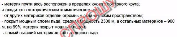 - покрыт мощным слоем льда, средняя мощность 2300 м, а остальных материков – 900 м, на 99 материк покрыт мощным льдом;