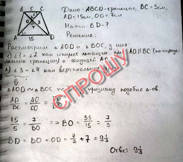 В трапеции abcd с основаниями bc и ad диагонали пересекаются в точке о найдите длину диагонали bd если bs 5см ad 15 см od 7 см