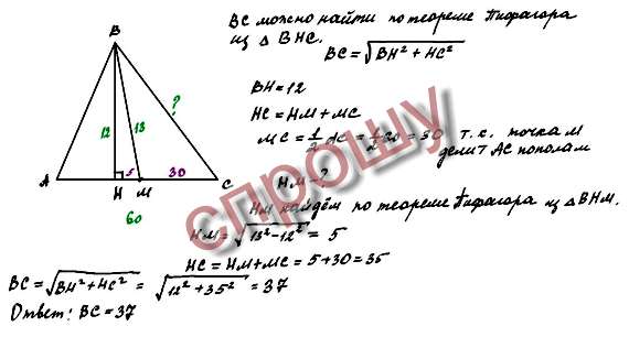 В треугольнике основание равно 60, высота 12, медиана проведенная к основанию равна 13, определите большую боковую сторону треугольника