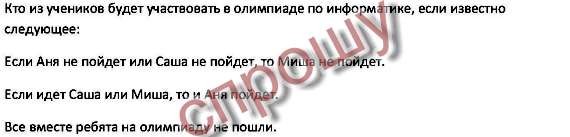 Пойдёт Аня. Потому что вместе идти не могли. то есть на олимпиаду пойдёт один ребёнок. Если пойдёт Миша или Саша, То Аня тоже пойдёт. А если пойдёт Аня, что случится в условии не сказано. значит пойдёт Аня.