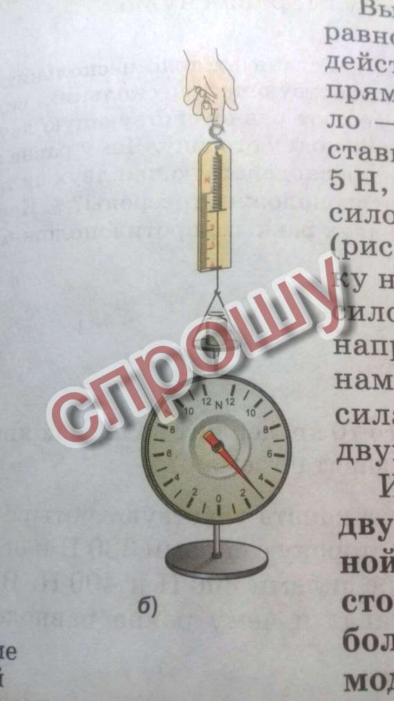 На этом рисунке на гирью действует равнодействующая сила. на столик динамометра поставили гирю а сверху прицепили динамометр. модель будет равняться R=F1-F2; R=5-3=2Н.