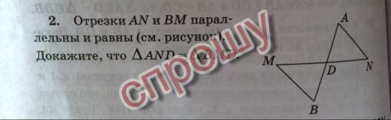 ∠A = ∠B; ∠N = ∠M как накрест лежащие при MB || AN и секущей АВ. MB = AN по условию, следовательно, треугольники MDB и AND равны (по второму признаку равенства треугольников)