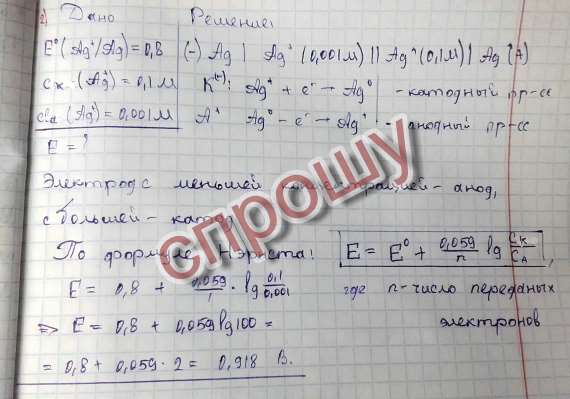 Составить гальванический элемент с серебряным катодом. Написать уравнения реакций, протекающих на электродах при работе этого элемента. Вычислить ЭДС, если концентрация ионов металла у катода равна 0,1 моль/л, а у анода 0,001 моль/л. Написать электродные процессы.