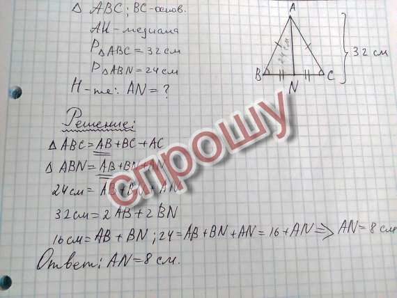 AN является медианой равнобедренного треугольника ABC с основанием BC . Найдите AN если периметр треугольника ABC равен 32 см, а периметр ABN равен 24 см.