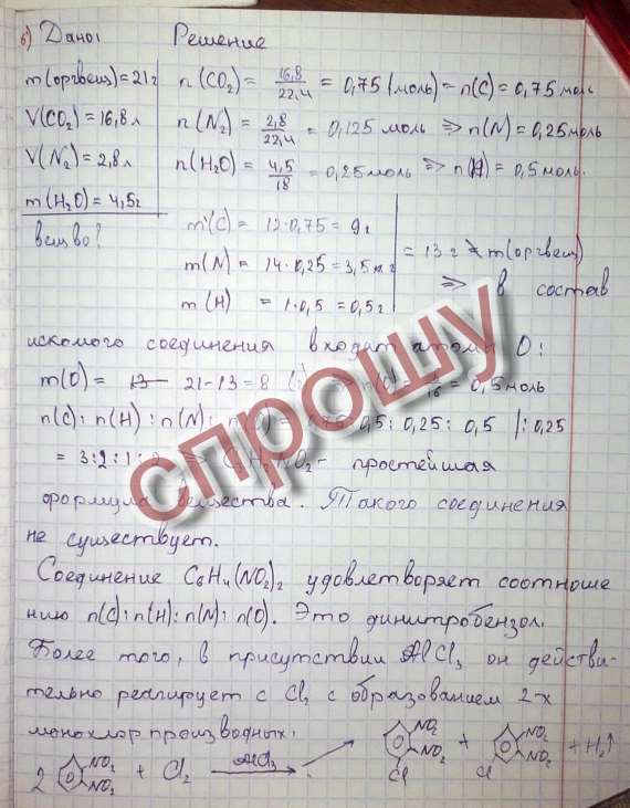 При сгорании вещества массой 21г образуется 16,8л СО2 , 2,8л N2 и 4,5 воды. Определить формулу вещества, если при взаимодействии с хлором в присутствии AlCl3 образуется 2-монохлорпроизводных.