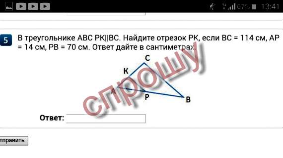 В треугольнике АВС проведена средняя линия РК. А всем известно, что средняя линия параллельна основанию и равна половине основания. 114:2=57см
